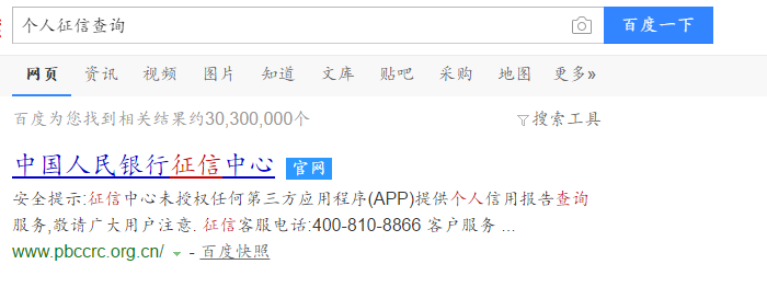 第一步:百度搜索“个人征信查询”,找到网站点击进入(https://www.pbccrc.org.cn)然后点击搜索结果中的网址打开网站,如下图所示。注:为了你的信息以及财产安全,请认准网址。