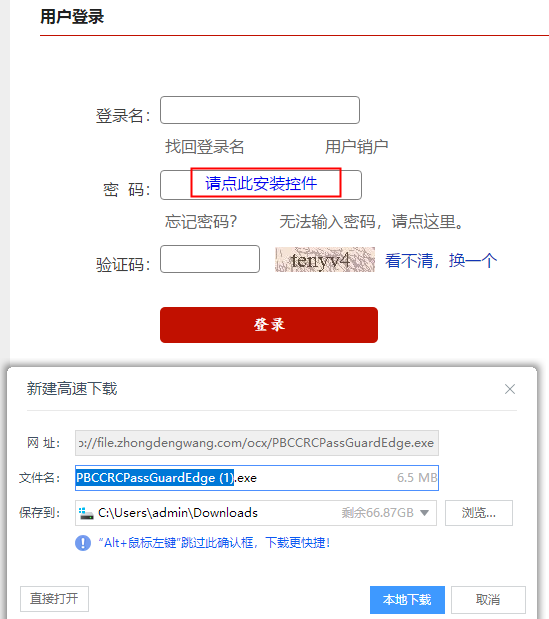 第八步:在输入密码的位置处点击“安装安全控件”,系统弹出安装提示框,点击【保存文件】,然后根据提示打开文件并安装。
