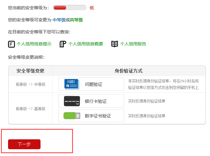 第十一步:安全等级变更的途径有三种,验证方式分别是①问题验证(非实时验证)②银行卡验证(实时验证)③数字证书验证(实时验证)。